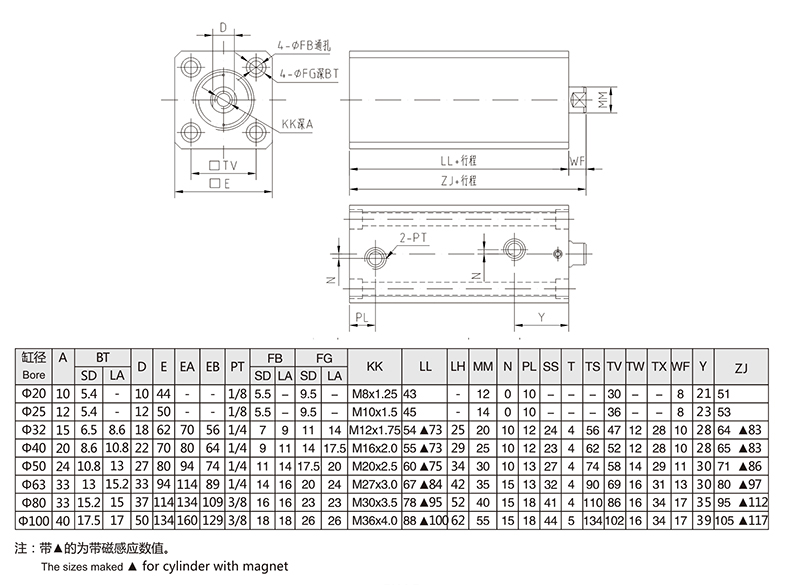 CX薄型油缸 SD型軸向安裝(單軸)外形安裝尺寸圖