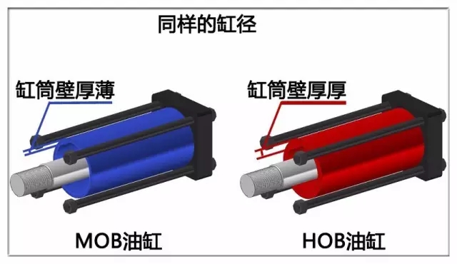 MOB油缸與HOB油缸相比:因承載壓力不同,在相同缸徑條件下,HOB油缸壁厚相對MOB油缸較厚。