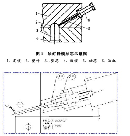 定模抽芯用油缸驅(qū)動(dòng),大大簡(jiǎn)化模具結(jié)構(gòu),降低成本;但需注意動(dòng)作順序的控制和滑塊鎖緊,以免動(dòng)作錯(cuò)亂損壞模具或油缸鎖緊力不足而無(wú)法封膠,抽芯力不足而抽不動(dòng)滑塊。