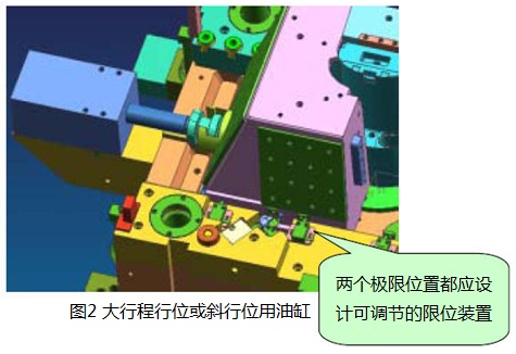 在模具結(jié)構(gòu)中油缸應(yīng)有行程限位控制開(kāi)關(guān),確保活塞端隙;同時(shí)應(yīng)具備模具生產(chǎn)時(shí)自動(dòng)控制所必須的信號(hào)源。